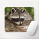 Um mouse pad com uma fotografia de um guaxinim fofo e curioso descansando seu rosto em um tronco de madeira. Adorável.