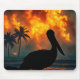 Um pelicano se posiciona em uma praia silenciada contra um incêndio no horizonte