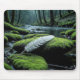 Uma cena da floresta serena apresenta uma pena branca que repousa sobre uma rocha coberta de musgo ao lado de um riacho tranquilo
