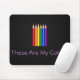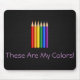 Mousepad com lápis nas cores de LGBT (pessoas lésbicas, gay, bissexuais e transexuais), bandeira das faixas do arco-íris, orgulho gay lgbtqiap+ design, texto de modelo "Estas são minhas cores", de pinkbrickroad