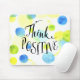 Citação inspiradora da caligrafia moderna - pense positiva - no fundo de pontos de aquarela azul e verde| Bigstock® - Todos os direitos reservados.