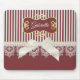 Um mousepad de estilo vitoriano vintage com fitas verticais coloridas, cor vermelha e cremosa, gravadas com uma fita colorido creme amarrada em um arco doce colada em uma corda de pérolas elegantes. Personalize este design elegante adicionando seu nome ao quadro com borda dourada do ornamentado. NOTA: Esta é uma imagem impressa em formato plano. O arco, o rendas, as pérolas e o quadro de ouro NÃO são reais.