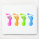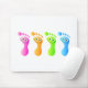 Uma fileira de quatro pegadas humanas coloridas com caras felizes.