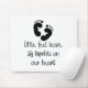 Pegadas pretas do bebê e texto preto que lê "impressões grandes da licença pequena dos pés em nosso coração!" é caracterizado em t-shirt, em canecas, em mousepads, em sacolas, em botões, e em outros artigos, excelente para qualquer um que está esperando um bebê ou tem quem mandou um bebê novo chegar!
