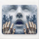 Par das mãos e face pressionado em vidro molhado com silhueta de uma multidão aflita de pessoas