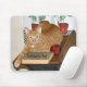 Gato de mesa laranja numa velha mesa de escola com uma maçã e um livro "Professores Pet" língua fotográfica em amantes de gatos e professores amigo mousepad