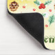 Um mouse pad com um padrão fofo com cones de pínus e holly sobre um fundo de aquarela amarela com pequenos círculos brancos espalhados por aí.