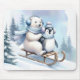 Um urso polar e um pinguim estão vestindo algemas e lenços, alegremente andando por um trenó abaixo em flocos de neve.