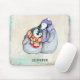 Um mouse pad personalizado com uma ilustração adorável de um casal de pinguim se amontoando. Vestindo lenços e chapéus de inverno. Colocar sobre uma textura vítrea creme colorida com acentos turquesa ao longo das bordas.