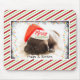 Um mouse pad para a estação festiva! Ilustrado com uma foto adorável de um filhote de cachorro dormindo enquanto veste um chapéu de santa. Feliz Natal está escrito na banda de seu chapéu, com uma letra manuscrita na moda. Uma borda cinza com luzes coloridas de Natal cercando a moldura dessa foto fofinha. O fundo é um padrão festivo listrado de cana doce em branco vermelho e verde. O texto diz Pugs & Kisses e pode ser alterado/personalizado para atender às suas necessidades.