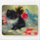 Mouse Pad com um gatinho preto e branco! Esse tuxedo fofo se posou entre as flores vermelhas num cobertor azul. Um presente magnífico para amantes de gatos e entusiastas de arte vitorianos!