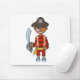 Um garoto vestindo uma fantasia de pirata com um colar de olho e segurando uma espada pronta para picar ou tratar na noite de halloween.