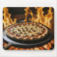 Uma pizza que dá água à boca, com enchido e assares de queijo numa panela, rodeada de chamas dramáticas num forno a lenha