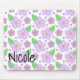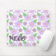 Um mouse pad construído com um padrão de flor lilás. Personalize-o com o seu próprio texto, cor de fundo, entre outras opções.