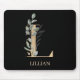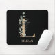 Florial do monograma da letra L. A letra L na textura marrom ouro acentuada com folhas compostas de cor aquosa verde, flores e pó de ouro. Personalizado com o nome na fonte correspondente.