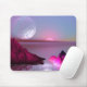 Um 3d colorido rende de um oceano no por do sol com um planeta que pareça luminoso, poderia ser formações de rocha de cristal e coloridas do oceano em um mar da lavanda.