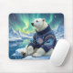 A polar bear, wearing a colorful sweater, sits on an ice floe as the aurora borealis illuminates the sky, creating a magical backdrop