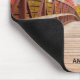 Um mouse pad com uma fotografia cênica. Uma ponte de madeira em direção a um caminho rodeado por árvores florestais mudando de cor.