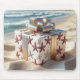 Um presente maravilhosamente embrulhado, enfeitado com padrões de estrelas-do-mar, senta-se nas areias ouros de uma praia, com leves ondas de oceano que caem no fundo