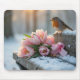 Um assento pisca num banco de neve ao lado de um buquê de tulipas cor-de-rosa, com um ligeiro nascer do sol ao fundo