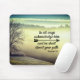 O mouse guião inspiracional retrata uma fotografia da natureza com céus azuis e nevoeiro sobre as montanhas. Ele apresenta uma Bíblia encorajadora Verse Proverbs 3:6, "De todas as formas, ele o reconhecerá e dirigirá seu caminho."