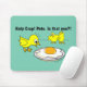 Puta que pariu! Pete, é você? Engraçado design de humor de desenho animado. Dois Pintinhos de cor amarela se assustando quando veem um ovo cozido em uma placa. A turquesa / fundo verde pode ser alterada para qualquer cor.