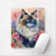 Mousepad apresenta uma delicada trabalho de arte de aquarela de um lindo gato boneco de pano cercado por flores em um retrato de animais estéticos femininos. O felino fofo, de olhos azuis está olhando para o lado nesta vibrante pintura floral multicolorido.