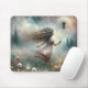 Uma jovem de cabelo fluido é representada correndo por um campo segurando uma cabeça grande de semente de dandelion no estilo Monet trabalho de arte
