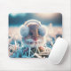 Um pequeno rato com protetores auriculares no meio de um chão congelado rodeado por uma luz suave e brilhante