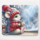 Um camundongo aconchegante num suéter vermelho e um chapéu sentado ao lado de uma janela de fosco segurando uma xícara de cacau quente enquanto admira uma paisagem de neve com pinheiros e flocos de neve