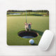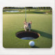 Um rato baleado na borda de um buraco de campo de golfe no verde perto de uma bola de golfe