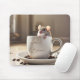 Rato bonito em uma xícara de café com rachaduras e grãos de café.
