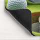 Pequeno rato surpreendido num buraco de campo de golfe com clube de golfe e bola perto da borda