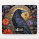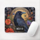 Mousepad com um corvo preto. Um arco amarelo atrás. Cercado por flores vermelhas e roxas. Legal vibração gótica.