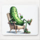 Um picles antropomórfico alegre relaxa numa cadeira com uma bebida verde e palha