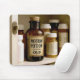 Uma velha garrafa de remédio com um rótulo humorístico para idosos, colocada em um armário de remédios