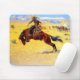 Mouse Pad com pintura a óleo de Frederic Remington, Manhã Fria na Faixa (1904). Um vaqueiro anda a cavalo marrom e ambunicioso. Um presente de excelente para amantes de cavalos e para o Velho Oeste.
