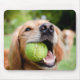 Uma foto de perto de um Retriever de Ouro com uma bola de tênis amarela na boca.