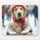Um recuperador de ouros vestindo um gorro vermelho e cachecol segura um par de skates de gelo em sua boca, parado em um piscar de gelo ao ar livre