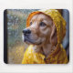 Um cão apanhador de ouros vestindo uma capa de chuva amarela sai pela janela esfolada com gotas de chuva