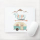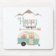 A arte digital em branco apresenta texto "Camper Feliz", seta estilo Boho, silhueta de montanha e trailer viagem RV estilo retrô