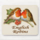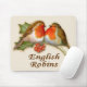 Dois Robins ingleses sentados em um galho Holly com frutas vermelhas. O texto diz Robins ingleses.