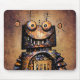 Robô oxidado pequeno bonito com um grande sorriso grande em um tapete do rato legal engraçado! Robôs do amor! Uma ilustração engraçada do robô por Paul Stickland para StrangeStore. Robôs pequenos mais engraçados das cargas para miúdos de todas as idades em StrangeStore.