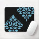 Role e folha damask repete design em um detalhe azul-médio em um plano de fundo preto.