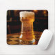 A glass shaped like a rook from a chess game, filled with frothy beer, sits on a chessboard in a dimly lit bar room, creating an intriguing visual contrast between the amber liquid and the chessboard's pattern