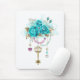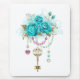 Chave de ouro antiga com rosas de turquesa de tendência, decoradas com folhas de ouro branco e miçangas cor-de-rosa e azuis. Cor agradável. Rosas de turquesa. Ouro branco. Tifania azul.