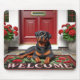 Um rottweiler preto e bronzeado fica sentado num tapete vermelho de boas-vindas em frente a uma porta vermelha brilhante cercada por plantas com flores