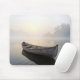 Um barco a remo de madeira flutua pacificamente num lago suave, rodeado por um nevoeiro suave que suaviza a luz do sol da ascensão