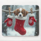 Uma Rua. O cachorrinho Bernard espia de uma meia de Natal vermelha pendurada numa linha entre duas luvas correspondentes