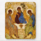 Antiquado Andrei Rublev trabalho de arte/ícone representando o Pai, o Filho e o Espírito Santo sentados numa mesa. As imagens parecem ter asas de anjo.